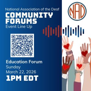 NAD Community Forums Education Forum National Association of the Deaf Community Forums Event Lineup Education Forum Sunday March 22, 2026 10 AM – PDT Link: Meeting Registration https://us02web.zoom.us/…/reg…/yocimCdcR3CaNCHk0x0wbg… + Add to Google Calendar + iCal / Outlook export Date Mar 22 2026 Expired! Time 10:00 am Share this event