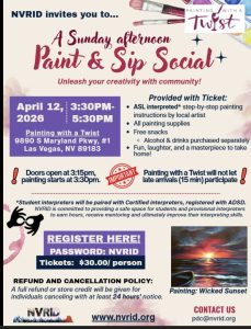 Image Description: A watercolor/painting themed flyer, reading: NVRID invites you to… A Sunday afternoon Paint & Sip Social! Unleash your creativity with community! [Painting with a Twist Logo] April 12, 2026 3:30PM-5:30PM. Painting with a Twist 9890 S Maryland Pkwy, #1 Las Vegas, NV 89183. Provided with Ticket: Asl Interpreted* step-by-step painting instructions by local artist, All painting supplies, Free snacks (Alcohol & drinks purchased separately), Fun, laughter, and a masterpiece to take home! Doors open at 3:15pm, painting starts at 3:30pm. [IMPORTANT Stamp] Painting with a Twist will not let late arrivals (15 min) participate! [Interpreting hands symbol] *Student Interpreters will be paired with Certified interpreters, registered with ADSD. NVRID is committed to providing a safe space for students and provisional interpreters to earn hours, receive mentoring and ultimately improve their interpreting skills. REGISTER HERE! [Link to https://www.paintingwithatwist.com/studio/las-vegas/event/4272872/ ] PASSWORD: NVRID Tickets: $30.00/person. REFUND AND CANCELLATION POLICY: A full refund or store credit will be given for individuals canceling with at least 24 hours’ notice. [Image of a stylized painting of a sunset over the ocean] Painting: Wicked Sunset. [NVRID Logo] www.nvrid.org CONTACT US pdc@nvrid.org.